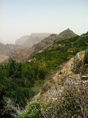 From the overlook, you could see small villages scattered on the terraces below. And the mountain was surprisingly green: the falaj systems keep the terraces blooming with grapes, pomegranates, apples, grass for goats, olive trees, and corn, among other crops.